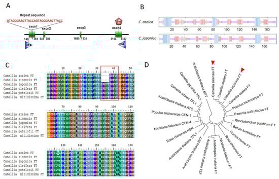 Amino acid alignment and phylogenetic analysis of CaFT and CjFT. (A) Predicted gene structure of CjFT; an additional 15 bp repeat sequence is found in exon 1 of CjFT compared to that of CaFT. (B) Predicted secondary structures of the CaFT and CjFT proteins, comprising alpha-helixes (blue), random coils (purple), extended strands (red), and beta-turns (green). CaFT and CjFT are mainly composed of α-helixes and random coils, with a greater combination these two structures found at the location of the repeat sequence in CjFT. (C) Multiple sequence alignment of CaFT, CjFT, and homologous FT proteins in Camellia. The five repeated amino acids are framed in the red box. (D) Phylogenetic tree of CaFT and CjFT showing tight clustering of the FT genes of Camellia.