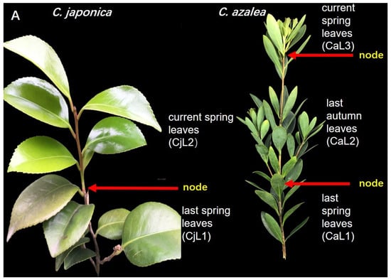 The C. azalea plants produce a large number of sprouts twice a year, while in C. japonica, they only sprout once. Therefore, there were two types of leaves that could be obtained before the formation of a large number of flower buds in April in C. japonica: those from the previous spring and those from the current spring. However, there were three leaf types for C. azalea in May: those of the previous spring (CaL1); those of the previous autumn, collected in May (CaL2); and those of the current spring (CaL3). Among the leaves collected from different locations, CaL2 and CjL1 (the leaves of the previous spring of C. japonica, collected in April) exhibited relatively higher expression levels. The tender leaves of the current spring showed very low levels of FT expression in both species, whereas no FT expression was detected in the old leaves of the previous spring of C. azalea (Figure 2C).