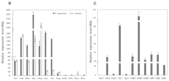 We detected the relative expression levels of CaFT and CjFT in the leaves at different periods and positions, and of the floral buds at different developmental stages of C. azalea and C. japonica, using qRT-PCR (Figure 2A). In the monthly leaves of C. japonica, the expression of FT was detected from January to August, with the highest expression levels observed from February to July. The peak of expression occurred in April, with a level three times higher than that of the second-highest level detected in June. April was also the month during which the largest number of flower buds formed in C. japonica. In C. azalea, FT was expressed throughout the year, with the highest expression levels were found from February to May. The peak of expression was in May, with a 2.7 times higher expression level than that in February, and with the second-highest expression level. Although the expression level sharply decreased as of June, low levels of expression were still detected up to December. The trend of expression level change was highly consistent with the period of flower bud formation in C. azalea. Comparing the two species, the expression of FT was more concentrated in C. japonica, whereas it was relatively scattered across the months in C. azalea. Although the expression level was higher in the peak month for C. japonica, C. azalea had a higher expression level of FT than that found in C. japonica for 8 months (Figure 2B).