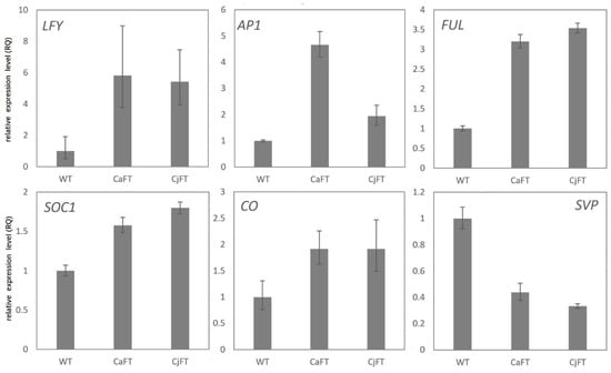 Expression of six genes involved in the flowering pathway in transgenic and wild-type plants. The results of CaFT-transgenic, CjFT-transgenic, and wild-type (WT) plants are averaged, respectively.