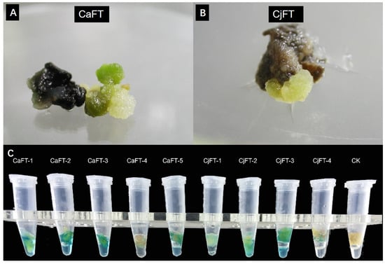 Based on the success of regenerated plants from the stems of C. azalea, we attempted to introduce CaFT and CjFT into the genome of C. azalea. After approximately 50 days of selective cultivation with hygromycin, the majority of the infected stems died gradually under the selection pressure, and only a few new calli emerged from the seemingly dead explants. Five transgenic tissue blocks of CaFT and four transgenic tissue blocks of CjFT were produced from the infected explants (Figure 5A,B). After PCR identification, new calli amplified the target gene, while the control group did not. The proliferative transgenic calli were detected by blue GUS staining (Figure 5C). These results confirmed the presence of both the CaFT and CjFT genes in the genome of the transformed C. azalea callus.