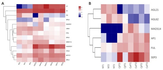 Heat map of the expression levels of genes involved in flowering pathways from the transcriptome data (A). The genes of flowering induction pathways; FT and its 12 upstream flowering-related genes. (B) MADS-box genes participated in the flowering pathway; six MADS-box genes were located downstream of FT. The numbers from −2 to 2 represented the changes in Log10- transformed relative TPM value from low to high, and zero mean log10 TPM = 0.