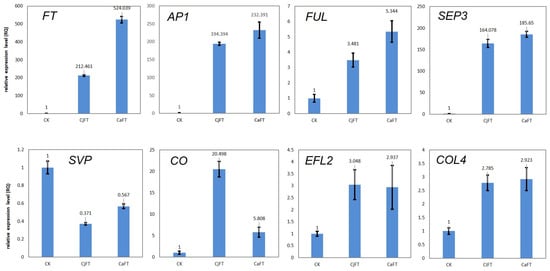 To verify the reproducibility and reliability of the transcriptome data, we detected the expression of the genes listed above via qRT-PCR. The expression patterns of most of these genes had a similar tendency to that found in the RNA-seq data. The genes located upstream of FT did not show significant differences in expression between transgenic and non-transgenic calli, whereas substantial differences in expression were found for the genes downstream of FT. In particular, the expression levels of AP1 and SEP3 showed a difference of over 150 times, and that of FUL showed a difference of over three times. The expression level of FT in CaFT was more than double that of CjFT, whereas there were only minor differences in the expression levels of AP1, SEP3, and FUL between CaFT and CjFT (Figure 8).