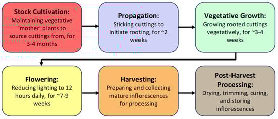 - Jones, M.; Monthony, A.S. Cannabis propagation. In Handbook of Cannabis Production in Controlled Environments; Zheng, Y., Ed.; CRC Press: Boca Raton, FL, USA, 2022; pp. 41–90. [Google Scholar]