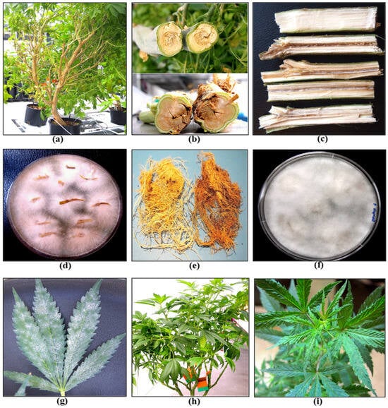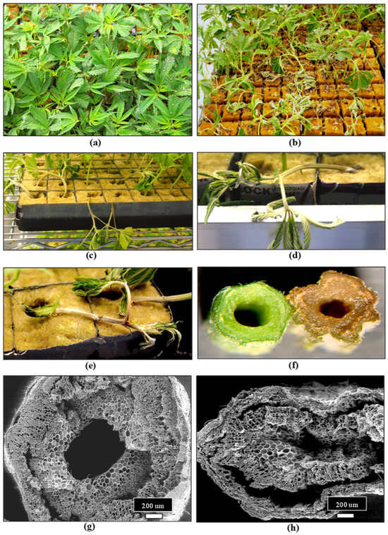 - Punja, Z.K.; Rodriguez, G. Fusarium and Pythium species infecting roots of hydroponically grown marijuana (Cannabis sativa L.) plants. Can. J. Plant Pathol. 2018, 40, 498–513. [Google Scholar] [CrossRef]