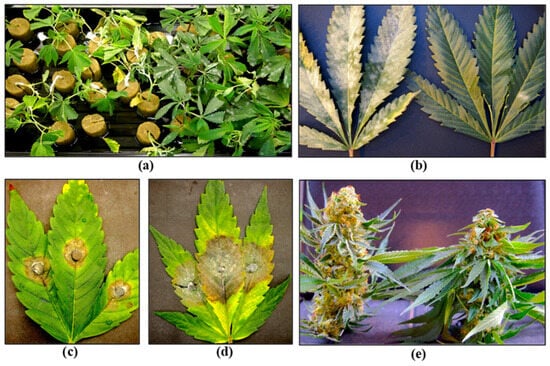 - Punja, Z.K.; Collyer, D.; Scott, C.; Lung, S.; Holmes, J.; Sutton, D. Pathogens and molds affecting production and quality of Cannabis sativa L. Front. Plant Sci. 2019, 10, 1120. [Google Scholar] [CrossRef]