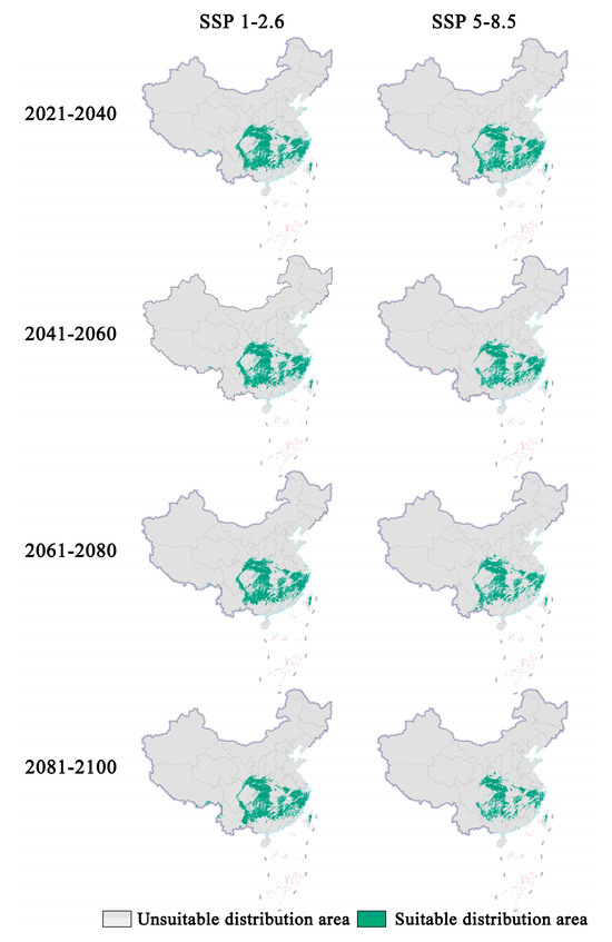 Prediction of future distribution areas of Zelkova schneideriana under different climate change scenarios in China. (Based on the standard map production of the Ministry of Natural Resources of the People’s Republic of China (bzdt.ch.mnr.gov.cn (accessed on 1 March 2024)), GS (2023) 2763; the base map boundaries remain unaltered. The same applies below.).