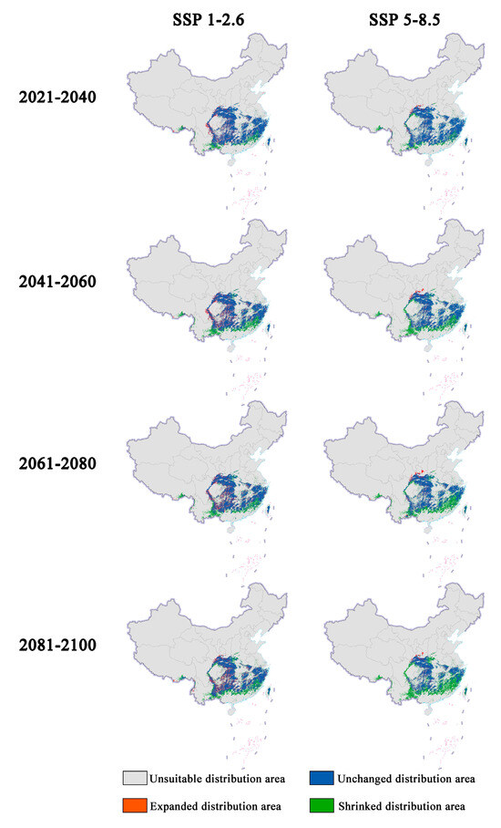 In future climate scenarios, the distribution area of Zelkova schneideriana is predicted to contract (Figure 1, Figure 2 and Figure 3). Under the SSP1-2.6 scenario, the contraction trend is relatively moderate, with a noticeable expansion (>10%) and contraction (>15%) of the distribution range. However, under the SSP5 8.5 scenario, the changes in the distribution area are more severe. Compared to the SSP1-2.6 scenario, the expansion trend is slowed (<10%), while the contraction trend intensifies. By 2081, the contraction is projected to reach close to 50%, posing a severe issue for the distribution of Zelkova schneideriana.