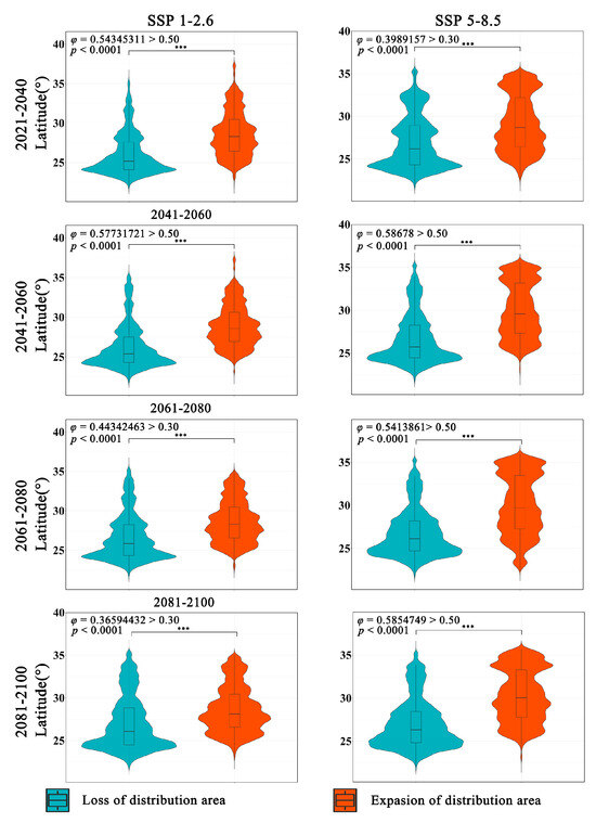 The latitudinal range of the expansion and contraction of the distribution of Zelkova schneideriana varies significantly regardless of climate scenarios (Figure 4). The contraction of Zelkova schneideriana distribution is concentrated in lower latitudes, with an increasing density of distribution at lower latitudes as time progresses. Conversely, the expansion area shows the opposite trend, with a higher density of distribution concentrated at higher latitudes and an increasing density of distribution at higher latitudes as time progresses. The differences between the SSP5-8.5 climate scenario and the SSP1-2.6 climate scenario are more pronounced in terms of distribution. Also, the latitudinal distribution density is not uniform. Both the statistically significant test (p < 0.0001) and the effect size measurement (φ > 0.3) indicate that this variation is not only statistically significant but also ecologically important.