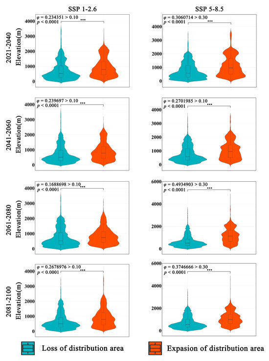 The overall trend of Zelkova schneideriana’s elevational changes in two climate scenarios is consistent (Figure 5). The expansion area has a higher distribution density at higher elevations compared to the contraction area. A statistically significant test (p < 0.0001) indicates that this change is statistically significant. However, the effect size of the SSP1-2.6 climate scenario is low (φ > 0.1), suggesting a mild distribution change. On the other hand, the SSP5-8.5 climate scenario has a higher effect size compared to SSP1-2.6, indicating a more pronounced tendency for Zelkova schneideriana to shift to higher elevations. The violin plots of the expansion and contraction areas in both scenarios exhibit clear elongated tails at higher elevations, indicating greater variability in the distribution at higher elevations.