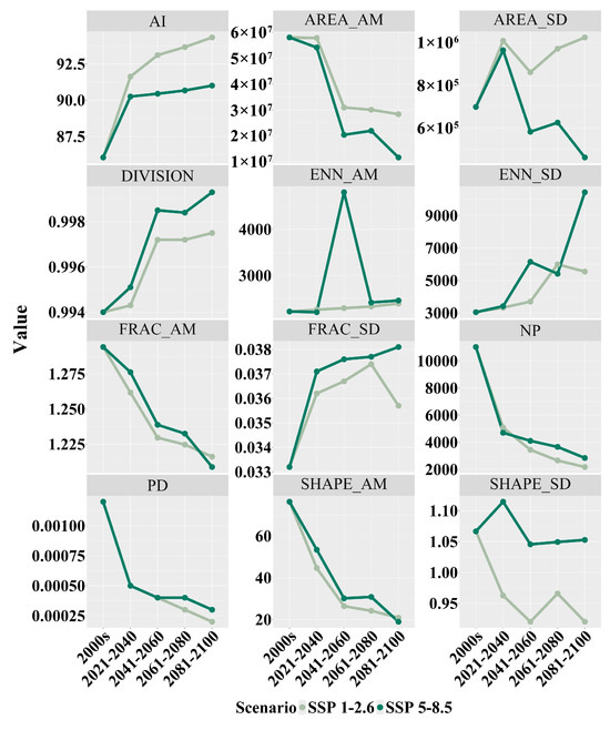 To comprehensively assess the potential risks of future distribution changes in Zelkova schneideriana, it is necessary to not only study the integrated impacts of climate and land-use changes [27] but also consider the spatial characteristics of the distribution area’s internal structure. The use of large-scale indicators that characterize geographical distribution changes cannot accurately evaluate their responses to climate and land-use changes [28]. Currently, landscape indicators have been developed and applied to comprehensively capture the structural changes of species within their distribution areas, thereby aiding in the elucidation of species’ ecological responses within complex landscapes [17,29].
