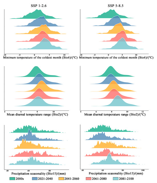 The results presented in Table 2 demonstrate that the contribution rate of Bio6 (minimum temperature of the coldest month) is the highest. Following this, Bio2 (mean diurnal temperature range) contributes the second-highest percentage. In comparison to elevation and precipitation, temperature factors have a higher contribution rate (79%). Under both climate scenarios, it is expected that Bio6 will experience a significant increase. The mean minimum temperature of the coldest month in the original distribution area is projected to rise from 0.769 °C to 3.449 °C (in the SSP1-2.6 climate scenario) and to 4.985 °C (in the SSP5-8.5 climate scenario) during the period from 2081 to 2100 (Table 3 and Figure 7). Additionally, the average Bio6 (mean diurnal temperature range) exhibits an increasing trend within the original distribution area, while the Bio15 (precipitation seasonality) shows an upward trend accompanied by greater variability (Table 3 and Figure 5).
