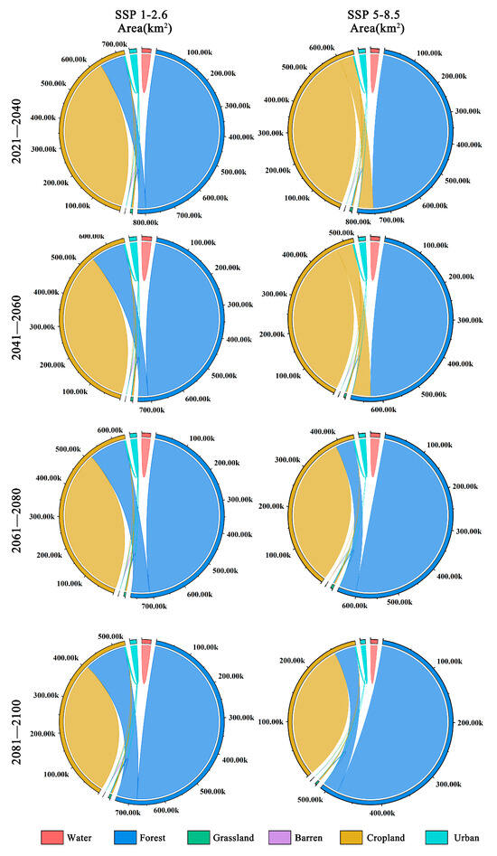 There are significant differences between the two scenarios of land-use change (Figure 8). Under the SSP1-2.6 climate scenario, land-use change is minimal due to human efforts in environmental conservation, leading to a gradual increase in forest area within the distribution area of Zelkova schneideriana. However, under the SSP5-8.5 climate scenario, from 2021 to 2060, we observed a substantial conversion of forest land into cropland within the distribution area of Zelkova schneideriana, accounting for over 50% of the total area. However, this trend reverses from 2061 to 2100, as cropland reverts back to forest land, resulting in the recovery of forest land, once again surpassing 50%.