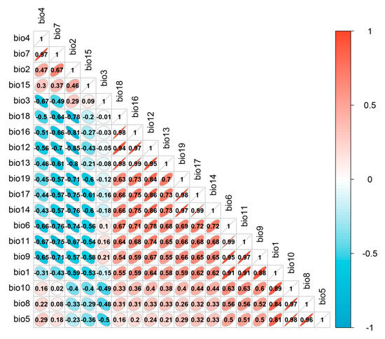 Due to the correlation among the 19 bioclimatic variables (Figure 9), using all of them in the model predictions may lead to overfitting. Consequently, this study screened the data of the 19 bioclimatic variables. Firstly, a correlation analysis was performed on the 19 climate variables. Then, an ensemble model was employed to model the 19 climate variables, yielding the important results for each variable. Variables with a correlation coefficient greater than 0.75 were considered highly correlated, and only those with high importance and interpretability were retained for species distribution modeling. The method of evaluating and selecting variables based on their importance using ensemble models allows for a more comprehensive consideration of each variable’s contribution to model predictions compared to other approaches for addressing multicollinearity [50,51]. Consequently, this method facilitates the selection of important variables, thereby enhancing the interpretability of the model. The climate variable data, digital elevation data, and land-use data used for modeling were standardized to a spatial resolution of 1 km using the resampling tool in ArcGIS 10.8.1.