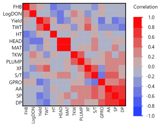 Heat map of Pearson’s correlation coefficients between characters: Fusarium head blight rating (FHB); Log10 deoxynivalenol content (LogDON); yield (kg ha−1); test weight (TWT); height in cm (HT); days to heading (HEAD); days to maturity (MAT); thousand kernel weight (TKW); percent plump kernels (PLUMP); fine grind extract (XF); soluble to total protein (S/T); grain protein (GPRO); alpha amylase (AA); soluble protein (SP); diastatic power (DP).