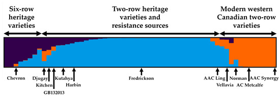 Sub-population membership for 58 barley genotypes grouped by three major clusters of genetic variants including (1) six-row varieties (purple); (2) Modern Canadian varieties (orange); (3) Two-row heritage and resistance source varieties (blue).