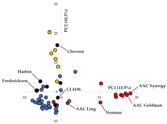 Scatter plot of analysis of first two principal components of genotype information involving 2358 single-nucleotide polymorphic (SNP) markers with colour highlights: (1) yellow points represent six-row heritage varieties; (2) blue points represent two-row heritage varieties; (3) black points represent common FHB resistance sources; (4) red points represent modern Canadian varieties.