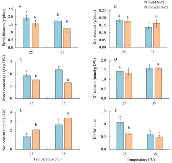 The effect of salinity (300 mM NaCl) and elevated temperature (35 °C) and their interaction with the fresh and dry biomass (A,B), water (C), and K+ and Na+ (D–F) contents in Sedobassia sedoides shoots. The different letters show statistically different means at p ≤ 0.05 (Tukey test).