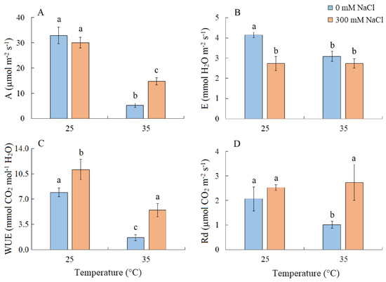 The effect of salinity (300 mM NaCl) and elevated temperature (35 °C) and their interaction with the intensity of apparent photosynthesis (A), transpiration (B), water use efficiency (C), and dark respiration (D) in Sedobassia sedoides shoots. The different letters show statistically different means at p ≤ 0.05 (Tukey test).