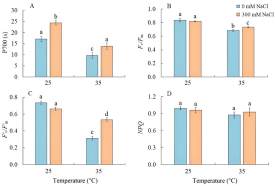 The effect of salinity (300 mM NaCl) and elevated temperature (35 °C) and their interaction with the activity of cyclic electron transport of PSI (A), maximum quantum efficiency of PSII (B), effective quantum efficiency of PSII photochemistry at a given light intensity (C), and nonphotochemical quenching of chlorophyll fluorescence (D) in Sedobassia sedoides shoots. The different letters show statistically different means at p ≤ 0.05 (Tukey test).
