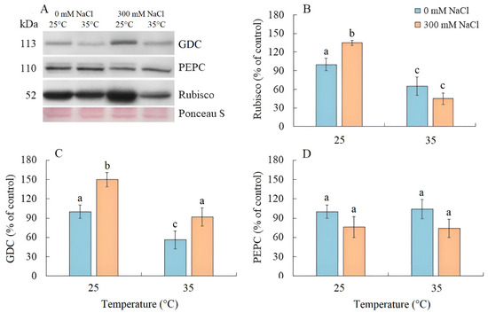 The effect of salinity (300 mM NaCl) and elevated temperature (35 °C), and their interaction with photosynthesis enzymes contents in Sedobassia sedoides shoots. (A) Western blots for three critical photosynthetic enzymes from total proteins extracted from shoots of S. sedoides plants, (B) Ribulose-1,5-bisphophate carboxylase/oxygenase (Rubisco, subunit L), (C) Glycine decarboxylase (GDC P protein), (D) Phosphoenolpyruvate carboxylase (PEPC). Blots were probed with antibodies raised against Rubisco (subunit L), GDC P protein, and PEPC. Relative enzyme contents are shown on the basis of intensity of Western blotting bands estimated using ImageJ 1.37v software (USA) and expressed relative to the average level for control plants taken as 100%. Equal protein loading was checked by staining the blots with Ponceau. Control plants were grown at 25 °C without NaCl treatment. The different letters show statistically different means at p ≤ 0.05 (Tukey test).