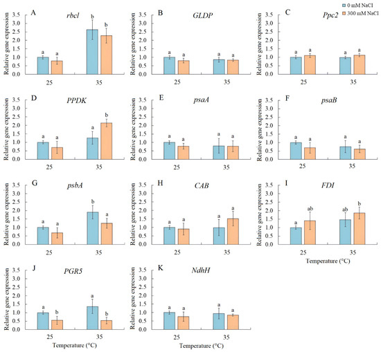 The effect of salinity (300 mM NaCl) and elevated temperature (35 °C) and their interaction with the expression of photosynthetic genes in Sedobassia sedoides shoots. (A) rbcL, encoding the large subunit of Rubisco; (B) GLDP, encoding the P subunit of GDC; (C) Ppc2, encoding PEPC; (D) PPDK, encoding pyruvate, orthophosphate dikinase; (E) psaA and (F) psaB, encoding apoproteins of PSI; (G) psbA, encoding the D1 protein of PSII; (H) CAB, encoding chlorophyll a/b-binding protein LHCB/CAB PSII; (I) FDI, encoding ferredoxin I; (J) PGR5, encoding the PGR5 protein, a key component of the main CET pathway of PSI; (K) NdhH, encoding the ndhH subunit of the NADH dehydrogenase in the second CET pathway of PSI. The different letters show statistically different means at p ≤ 0.05 (Tukey test).