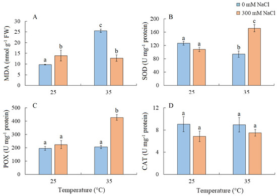 The effect of salinity (300 mM NaCl) and elevated temperature (35 °C) and their interaction with the lipid peroxidation (A) and antioxidant enzymes activity (B–D) in Sedobassia sedoides shoots. MDA, malondialdehyde; SOD, superoxide dismutase; POX, peroxidase; CAT, catalase. The different letters show statistically different means at p ≤ 0.05 (Tukey test).