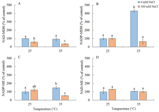 The effect of salinity (300 mM NaCl) and elevated temperature (35 °C) and their interaction with the malate dehydrogenase complex in Sedobassia sedoides shoots. The different letters show statistically different means at p ≤ 0.05 (Tukey test). (A) NAD-MDH; (B) NADP-MDH; (C) NADP-ME; (D) NAD-ME.