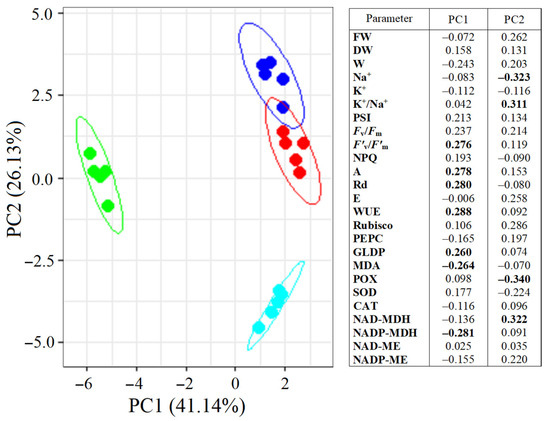 PCA divided S. sedoides plants into three groups (Figure 8). Plants grown under elevated temperature were clearly separated from the others by the first principal component (PC1), which accounted for 41.14% of the total variation. The main elements of PC1 were the NADP-MDH activity, F’v/F’m, GDC content, Rd and A intensity, WUE, and MDA levels. Plants subjected to combined stress were separated from the others by the second principal component (PC2). The main elements of PC2 were Na+ content, K+/Na+ ratio, and POX and NAD-MDH activity. Both principal components were sufficient to explain 67.27% of the changes in the total variation.