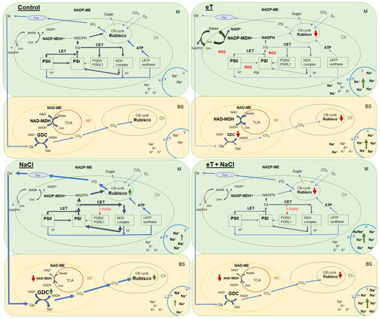 Schematic presentation of the changes in the photosynthetic reactions of the C2 halophyte Sedobassia sedoides in response to elevated temperature (35 °C) and salinity (300 mM NaCl), both individually and in combination. Control (25 °C + 0 mM NaCl); NaCl (25 °C + 300 mM NaCl); eT (35 °C + 0 mM NaCl); eT + NaCl (35 °C + 300 mM NaCl). M, mesophyll cell; BS, bundle sheath cell; Ch, chloroplast; Mt, mitochondria; Per, peroxisome; V, vacuole; CB cycle, Calvin-Benson cycle; TCA, tricarboxylic acid flux; LET, linear electron transport; CET, cyclic electron transport; PSI, photosystem I; PSII, photosystem II; GDC, glycine decarboxylase; Gly, glycine; Ser, serine; PG, phosphoglycolates; OAA, oxaloacetate; FDI, gene encoding ferredoxin I; PGR5, gene encoding the PGR5 protein, a key component of the main CET pathway of PSI. Red arrow indicates decreased activity/expression, and green arrow indicates increased content/activity.