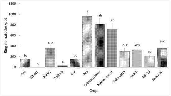 Nematode reproduction data from the two experiments were analyzed separately because of the existence of significant experiment by treatment interactions (p < 0.001). The reproduction of ring nematode significantly differed among the crops as presented in Figure 1 and Figure 2. The number of nematodes per pot in the first and second experiments ranged from 0 to 960 and 240 to 10,980, respectively. Wheat did not support nematode reproduction in the first experiment, and it supported the least reproduction in the second experiment. All crops supported statistically similar nematode reproduction relative to the control ‘Guardian’ in the first experiment; however, rye, barley, triticale, oat, vetch, radish, and ‘MP-29’ supported numerically lower reproduction. Wheat, triticale, and oat in the second experiment supported significantly lower nematode reproduction relative to the control while other crops had statistically similar reproduction. Furthermore, although statistically similar, rye and barley supported numerically lower nematode reproduction while the rest of the crops supported numerically higher nematode reproduction relative to the control.
