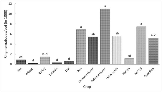Ring nematodes per pot 60 days after inoculation with 500 ring nematodes in the second greenhouse experiment. ‘Guardian’ was used as control. Data were means of five replications. Means followed by a common letter across bars are not significantly different according to Tukey’s HSD test (p ≤ 0.05).