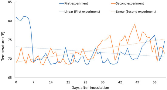 The reason behind differential host reactions to ring nematode by some crops (rye, barley, oats, and radish) was probably due to the existence of variable environmental conditions between two experiments. While, to our knowledge, no studies are available on the impact of the environment on the abundance, virulence and reproduction biology of ring nematode, the impact of the environment, specifically temperature, is well-documented for many plant-parasitic as well as free-living nematodes. A study published in 2023 reported that elevated soil temperatures have significant impact on the reproduction and virulence of root-knot and reniform nematodes, predicting a greater possibility of crop damage in the future era of climate change [6]. Another study found the nematode reproduction was largely a function of interactions among soil temperature, host crop and nematode species [15]. Other studies found nematode communities and their ratio were significantly changed upon minute change in the soil temperature and moisture [35,36]. We noticed the ambient temperature in the first experiment fluctuated more than in the second experiment (Figure 3). The temperature in the first experiment was high at 81 °F in the first week after inoculation, followed by a reduction in the range of 68 °F to 76 °F through the rest of the study period. The temperature in the second experiment was 68 °F on the day of inoculation, and it remained in the range of 68 °F to 73 °F until the fourth week, and 70 °F to 79 °F thereafter. The linear projection of temperatures suggested that the first experiment experienced a higher temperature in the beginning followed by a continuous decrease while the second experiment experienced the opposite phenomenon. The higher initial temperatures during the first experiment may likely have exerted stress on plants and nematodes, leading to reduced reproduction in relation to that in the second experiment.