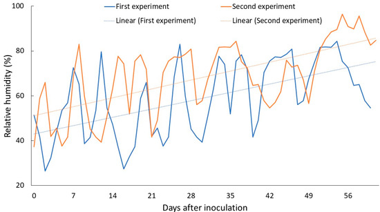 Relative humidity (RH%) during the first and second greenhouse study period.