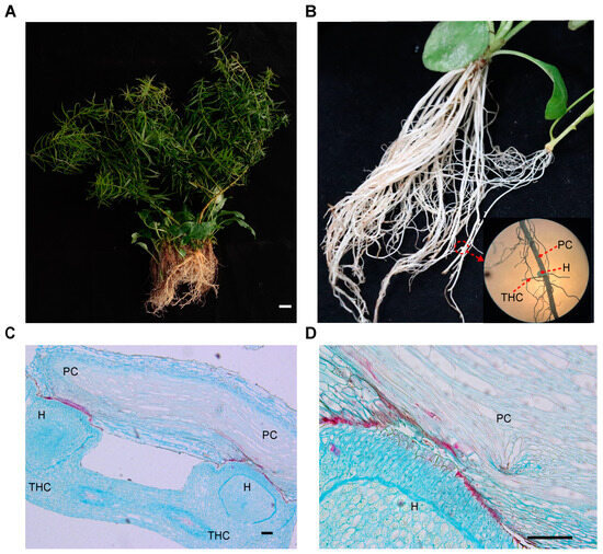 Morphology of T. chinense and its host P. vulgaris chimeric root. (A): T. chinense and its host P. vulgaris (scale bare: 1 cm). (B): T. chinense chimera is connected to its host P. vulgaris chimera through the haustorium. (C,D): Structure of T. chinense chimera, haustoria and P. vulgaris chimera (scale bare: 100 μm). THC: T. chinense chimera. H: Haustorium. PC: P. vulgaris chimera.