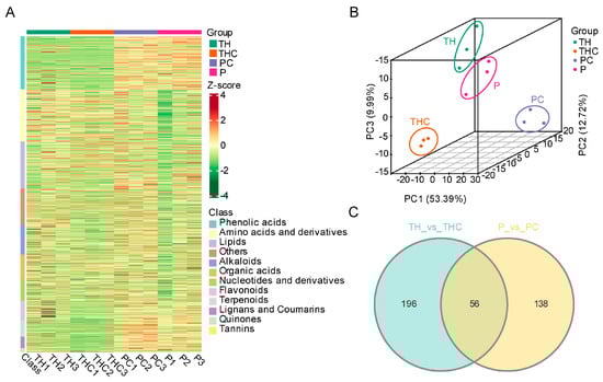 The metabolomic analysis of T. chinense and its host P. vulgaris post symbiosis. (A): Heat map visualization of metabolites in T. chinense, P. vulgaris roots and their chimera. (B): PCA analysis of metabolites in T. chinense, P. vulgaris roots and their chimera. (C): Venn diagrams revealing the relationship of differentially accumulated metabolites (DAMs) in T. chinense chimera and its host P. vulgaris chimera. TH: T. chinense. THC: T. chinense chimera. PC: P. vulgaris chimera. P: P. vulgaris.