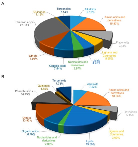 The proportion of differentially accumulated metabolites (DAMs) category in T. chinense chimera and its host P. vulgaris chimera. (A): TH vs. THC. (B): P vs. PC. TH: T. chinense. THC: T. chinense chimera. PC: P. vulgaris chimera. P: P. vulgaris.