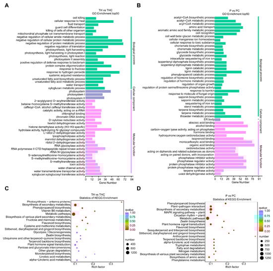 The enrichment analysis of DEGs based on GO terms and KEGG pathways. (A): GO terms of DEGs in TH vs. THC. (B): GO terms of DEGs in P vs. PC. (C): KEGG pathway analysis of DEGs in TH vs. THC. (D): KEGG pathway analysis of DEGs in P vs. PC. TH: T. chinense. THC: T. chinense chimera. PC: P. vulgaris chimera. P: P. vulgaris.