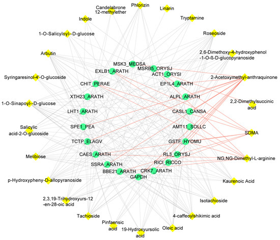 The correlation network of metabolites and genes related to haustoria formation. Metabolite and gene networks associated with haustorium formation. Green circles represent genes. Yellow diamonds represent metabolites. For associations between genes and metabolites, red lines represent positive correlations and gray lines represent negative correlations. The thickness of the line represented the correlation degree and the thicker the line, the higher the correlation. The correlation of haustoria formation related metabolites and genes are given in Table S9.