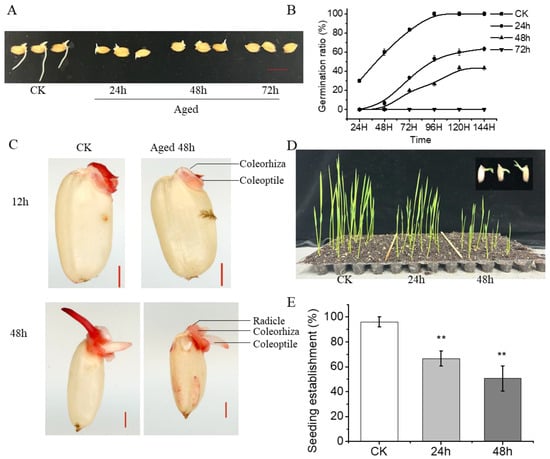 Aging significantly decreases rice seed germination and seedling establishment abilities. (A) Representative photographs of aged rice seeds during the imbibition process (48 h after sowing). Rice seeds were aged for 24, 48 or 72 h, 3 months after harvest, and then subjected to analysis. Scale bar = 10 mm. (B) Germination rates of rice seeds after different aging treatments. (C) 2,3,5-triphenyltetrazolium chloride (TTC) staining of CK and seeds aged for 48 h. Scale bar = 1 mm. (D) The early seedling establishment phenotype of different samples (A) immediately following germination (1 week after sowing). The top right corner of the image shows rice seeds subjected to 48 h of aging treatment, which fail to develop normal radicles and roots during early seedling growth. (E) The quantitative analysis of the seedling establishment rates of different samples are shown (1 week after sowing). Percentages are the average of three repeats ± SE. The asterisk (**) indicates a significant difference at p < 0.01 by Student’s t-test analysis.