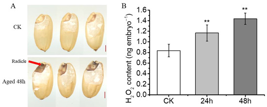 2.2. More H2O2 Is Accumulated in the Radicle of Seeds under Aging Treatment