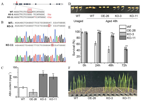 The plant hormone ABA plays a crucial role in regulating seed vigor [8,9,26]. According to transcriptomic data reported by Wang et al. [8], the ABA catabolism gene, abscisic acid 8′-hydroxylase 2 (OsABA8ox2), which is significantly induced by aging treatments, appears to play an important role in ABA catabolism during the artificial aging process. To investigate whether OsABA8ox2 influences seed aging, we generated rice OsABA8ox2 knockout mutants using the CRISPR/Cas9 method as in [27] and an OsABA8ox2 overexpression line. Sequencing analysis confirmed the presence of two independent mutants, KO-3 and KO-11, which harbored a 1-bp deletion and a 1-bp insertion in the first exon of OsABA8ox2, respectively (Figure 3A,B). Subsequently, we assessed the ABA content in rice seeds of the OsABA8ox2-OE line and OsABA8ox2 mutants. Our results revealed that overexpression of OsABA8ox2 significantly reduced the ABA content in rice seeds, while the content in OsABA8ox2 mutants increased significantly (Figure 3C).