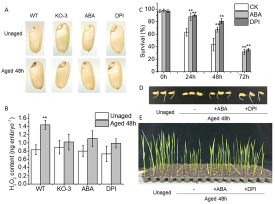 The interplay between ABA and H2O2 in plant tissues has been extensively discussed in the literature [11,28], with confirmation of their pivotal roles in seed vigor [8]. Thus, we investigated whether the increased resistance against aging observed in OsABA8ox2 mutants is associated with changes in H2O2 and ABA levels. To test this hypothesis, we examined H2O2 contents in OsABA8ox2 mutant seeds and observed that the H2O2 levels in seeds of KO-3 were significantly lower than those of the WT (Figure 4A,B). We postulated that the existence of ABA reduces the concentrations of H2O2 during accelerated aging. Indeed, seeds primed with ABA exhibited a slight, albeit not significant, increase in H2O2 content after 48 h of aging treatment (Figure 4A,B). Similarly, seeds pretreated with DPI also showed reduced H2O2 accumulation in the embryo following aging treatment (Figure 4A,B).