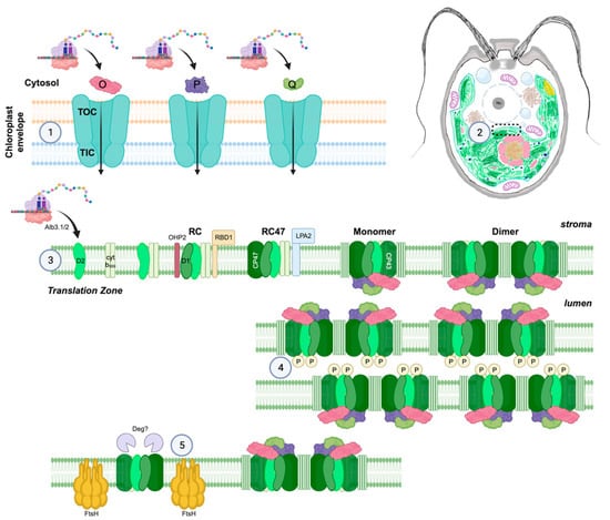- Choquet, Y.; Wollman, F.-A. The assembly of photosynthetic proteins. In The Chlamydomonas Sourcebook; Elsevier: Amsterdam, The Netherlands, 2023; pp. 615–646. [Google Scholar]