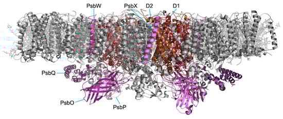 The PSII C2S2 complex from Chlamydomonas from (PDB ID 6KAC) [54]. Nuclear-encoded PSII subunits are shown in shades of purple.
