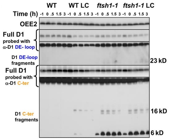Discrete D1 fragments accumulate in Chlamydomonas in an FtsH mutant [150]. Note the appearance of ~23, 16–20 kDa, and 6–10 kDa fragments in the lower panels. (WT: wild type; LC: chloroplast translation inhibitors lincomycin and chloramphenicol added; ftsh1–1: mutant with defective FtsH protease due to a FtsH1−R420C mutation; OEE2: loading control probing PsbP). Reproduced with permission from Oxford University Press, Oxford, UK.