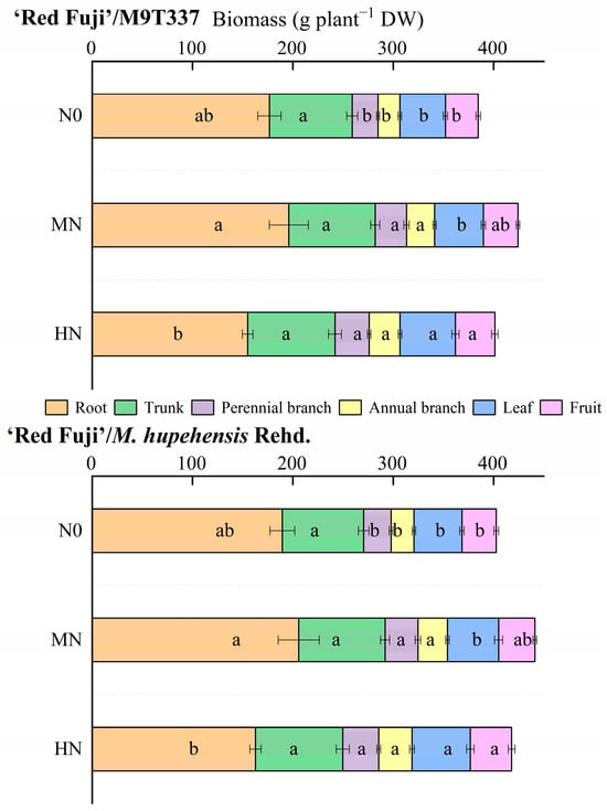 Different levels of N application had different effects on the biomass of apple organs (Figure 1 and Table S1). Overall, the total biomass of arborized trees was higher than that of dwarf trees. With the increase in the N application level, the root biomass first increased and then decreased. The root biomass of the HN treatment was lowest, at 13.98% (‘Red Fuji’/M9T337) and 16.44% (‘Red Fuji’/M. hupehensis Rehd.) lower than the N0 treatment (p > 0.05). With the increase in the N application level, the biomass of annual branch, leaf, and fruit increased gradually and was highest under the HN treatment. HN was not conducive to root growth and led to shoot overgrowth.
