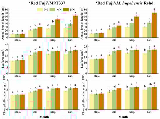 Figure 2 and Table S2 show the effects of N application in spring and summer on annual branch length, leaf area, and chlorophyll content of ‘Red Fuji’/M9T337 and ‘Red Fuji’/M. hupehensis Rehd. under different N levels. Over time, the annual branch length, leaf area, and chlorophyll content of ‘Red Fuji’/M9T337 and ‘Red Fuji’/M. hupehensis Rehd. increased gradually. There was no significant difference in the new annual branch length in May under the N treatment, but it reached a significant level after July. In October, the growth rate of the new annual branch length of arborized trees was higher than that of dwarf trees. Compared with N0, MN and HN treatments increased the annual branch length and leaf area of ‘Red Fuji’/M9T337 and ‘Red Fuji’/M. hupehensis Rehd. to different degrees. In different periods, the chlorophyll content of the MN and HN treatments was higher than that of N0, although there was no significant difference in May. Over time, the chlorophyll content of ‘Red Fuji’/M9T337 and ‘Red Fuji’/M. hupehensis Rehd. showed an increase with the increase in N application level. HN had the most significant effect on annual branch length.