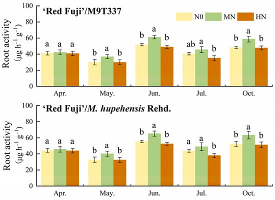 Root activity of apple under different N levels at different stages. Error bar indicates the standard deviation of three replications. Different letters indicate statistically significant differences (p < 0.05).