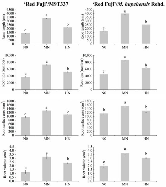 Root morphology of apples under different N levels during maturity stage. Error bar indicates the standard deviation of three replications. Different letters indicate statistically significant differences (p < 0.05).